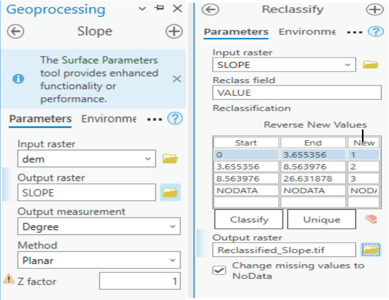 - Use the Slope tool to calculate terrain steepness and reclassify: