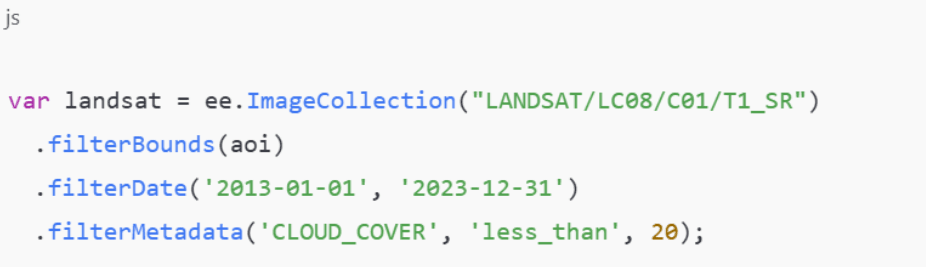 Use Landsat 5, 7, and 8 for continuous multi-decade coverage. Apply filters for cloud cover, date ranges, and AOI.Example (JavaScript):