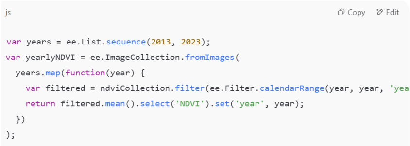 4. Create Annual NDVI Composites: Aggregate NDVI by year to create a time series of vegetation health.