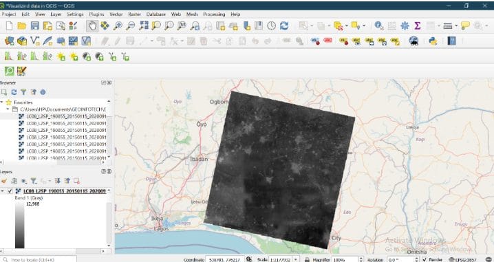 Once added, the raster may appear in grayscale or coloured depending on its values.