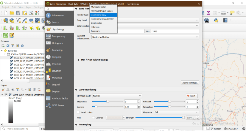 - Choose Render type (e.g., Singleband gray, Multiband color)
