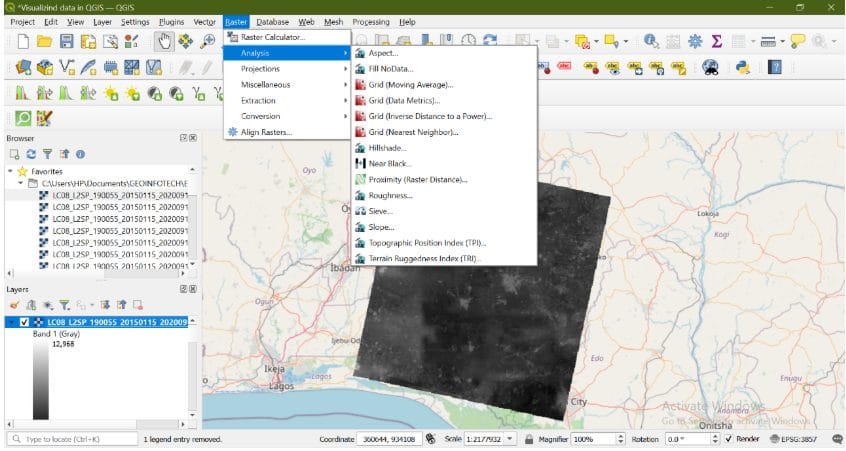 Let’s say we’re working with a DEM for flood risk analysis in Lagos. We can load the DEM, visualize elevation with a colour ramp, and extract low-lying areas by applying filters in the raster calculator.