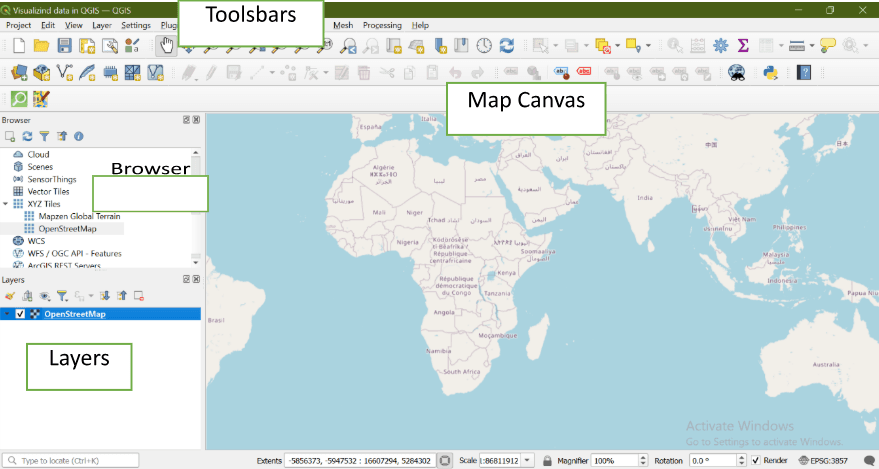 - Browser Panel (Optional, Often on the Left or Bottom): Shows your file system (like File Explorer). This lets you drag in shapefiles, GeoTIFFs, or other GIS files directly.