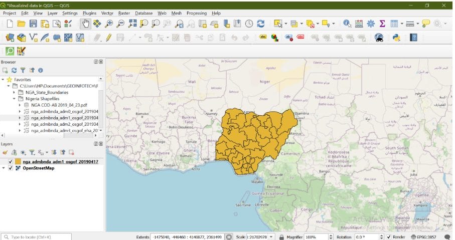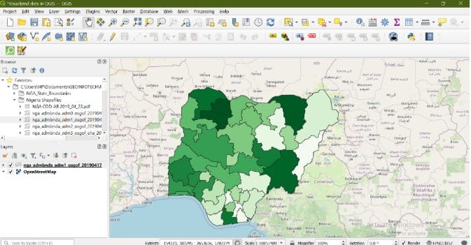 Once your folder is visible, loading a shapefile is as easy as dragging and dropping and the data will instantly appear both in the Map Canvas and in the Layers Panel on the left side of the interface.