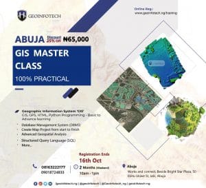 The benefits of Geoinfotech GIS master class training. This course will develop your skills from beginners to advanced level in spatial data analysis, Cartographic mapping, making maps, application of Python programming and apply SQL in the database management system