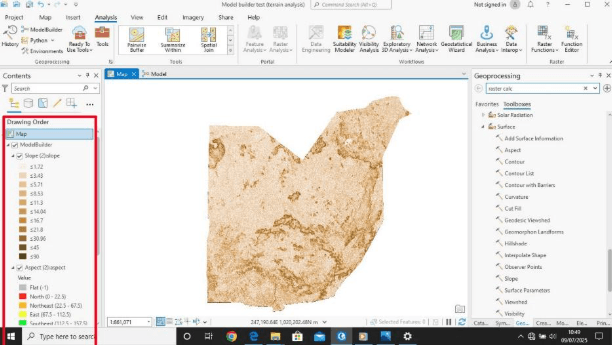 Tools: Slope, Aspect, Reclassify, Raster Calculator.