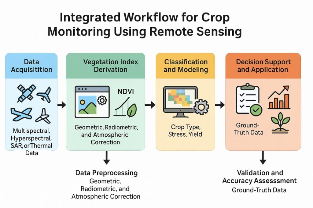 Crop monitoring through remote sensing follows a structured workflow that transforms raw imagery into actionable agricultural intelligence. The process are firmly summarised as follows: