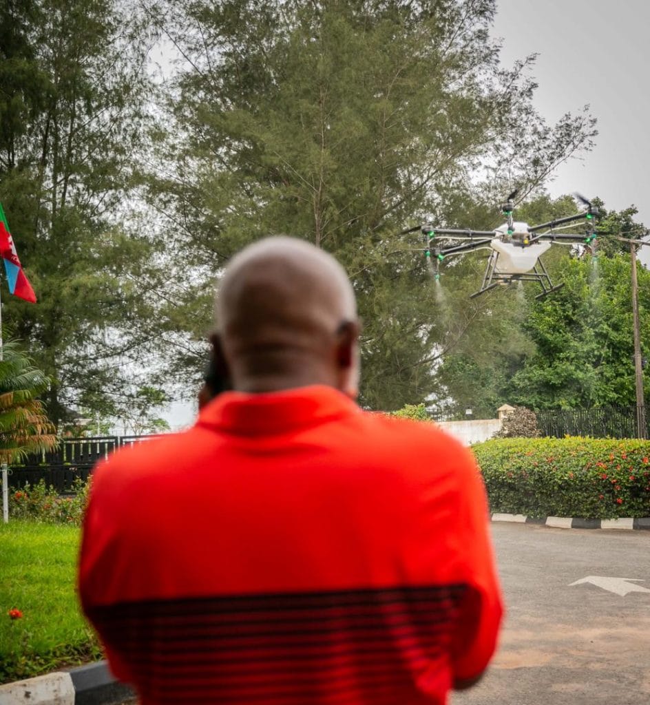 “The young innovators at @Ng FlyingLabs & @beatdrone have shown me how they re-use our agricultural drones to disinfect public sites to help stop the spread of # COVID19. They’ve also provided me with a progress update on the drone assembly plant in Akure they’re building.”